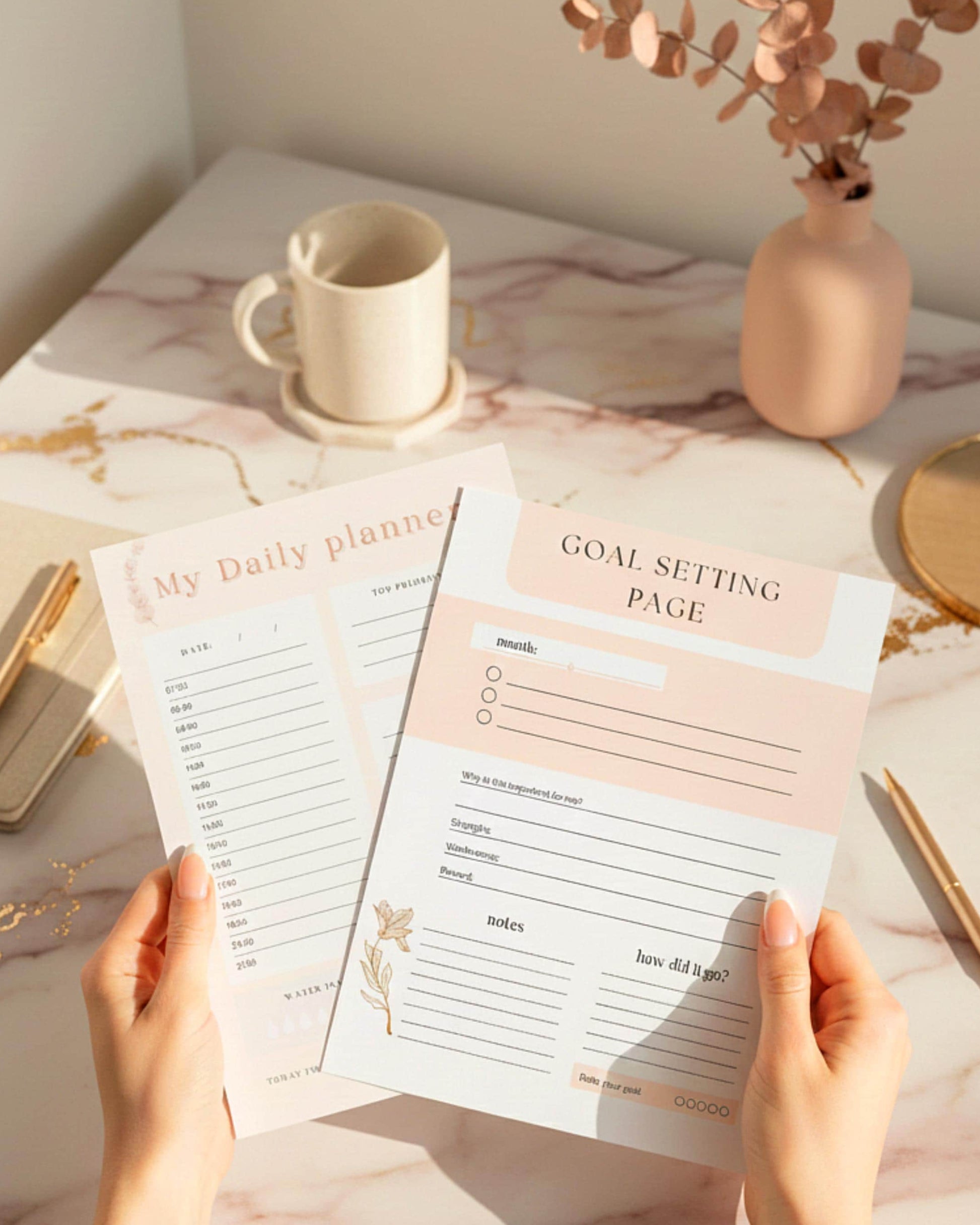 Designed for women who love minimal aesthetics, soft neutral tones and intentional living, this planner helps you organize your days, set meaningful goals and reset your mindset — without overwhelm.